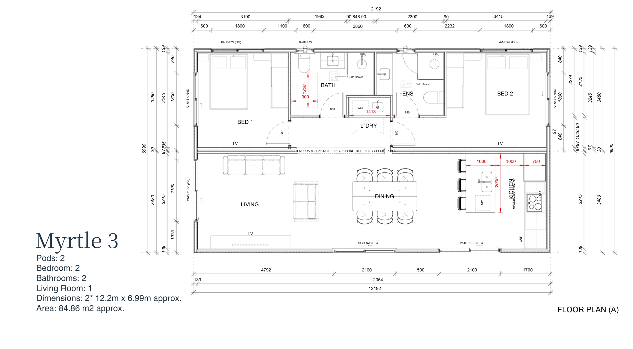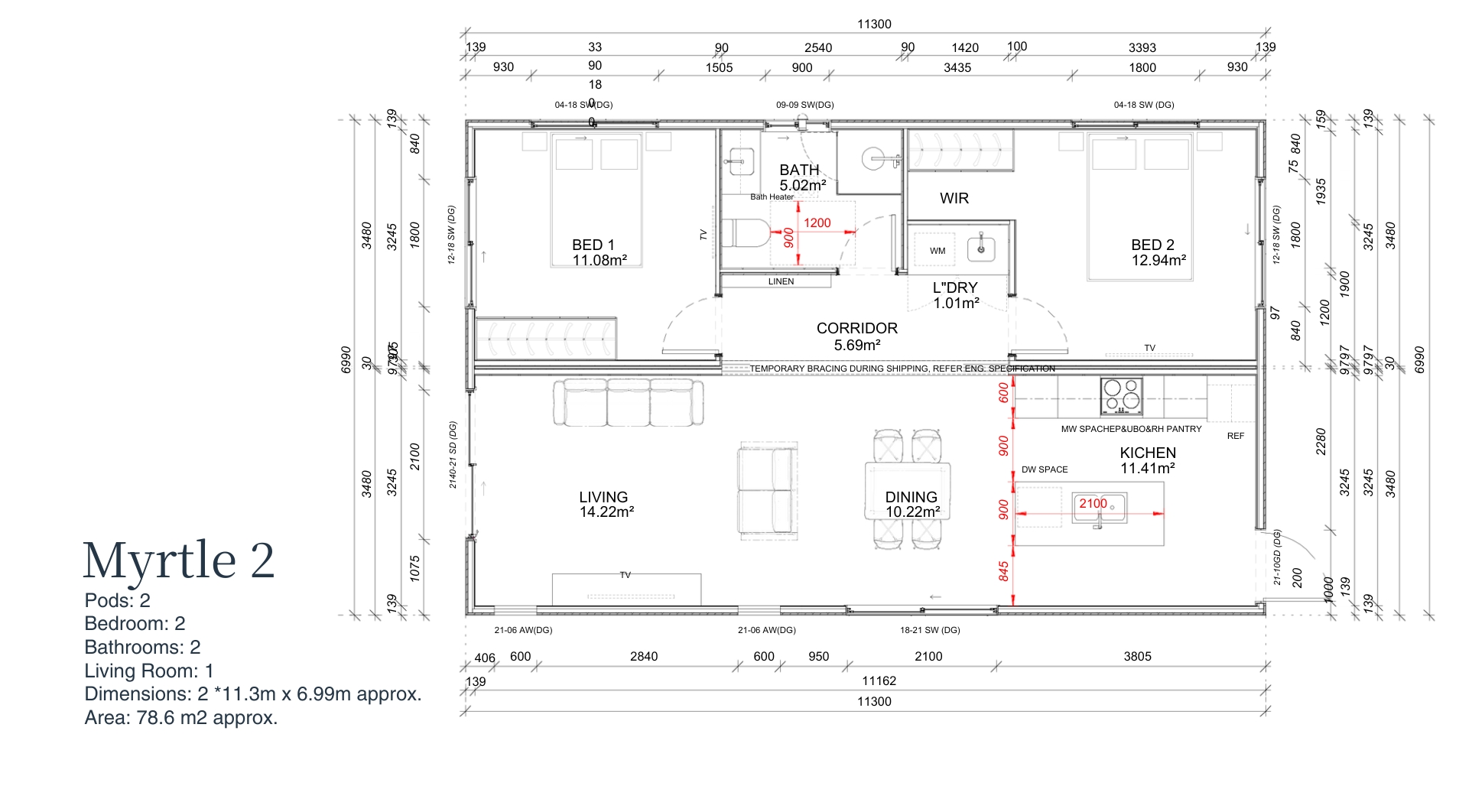 The Myrtle is a versatile 2 bedroom, 1 bathroom modular home offering plenty of space across 78.6m² (11.3m x 6.99m, 2 pods). With a smart layout that balances open living areas and private bedrooms, it’s ideal for couples, small families, or as a stylish secondary dwelling.